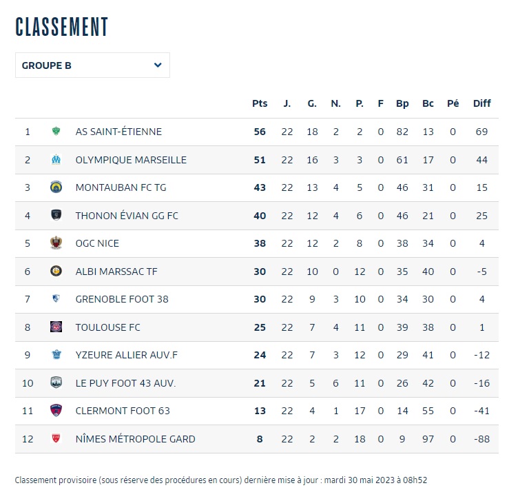 L’OM, Montauban, Thonon Evian, l’OGC Nice et Albi Marssac intègrent la nouvelle poule unique de D2F en compagnie de 5 clubs de la poule A et de Rodez et Soyaux, relégués de D1F.