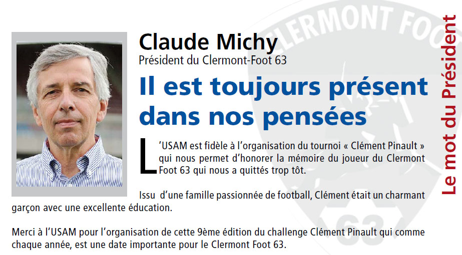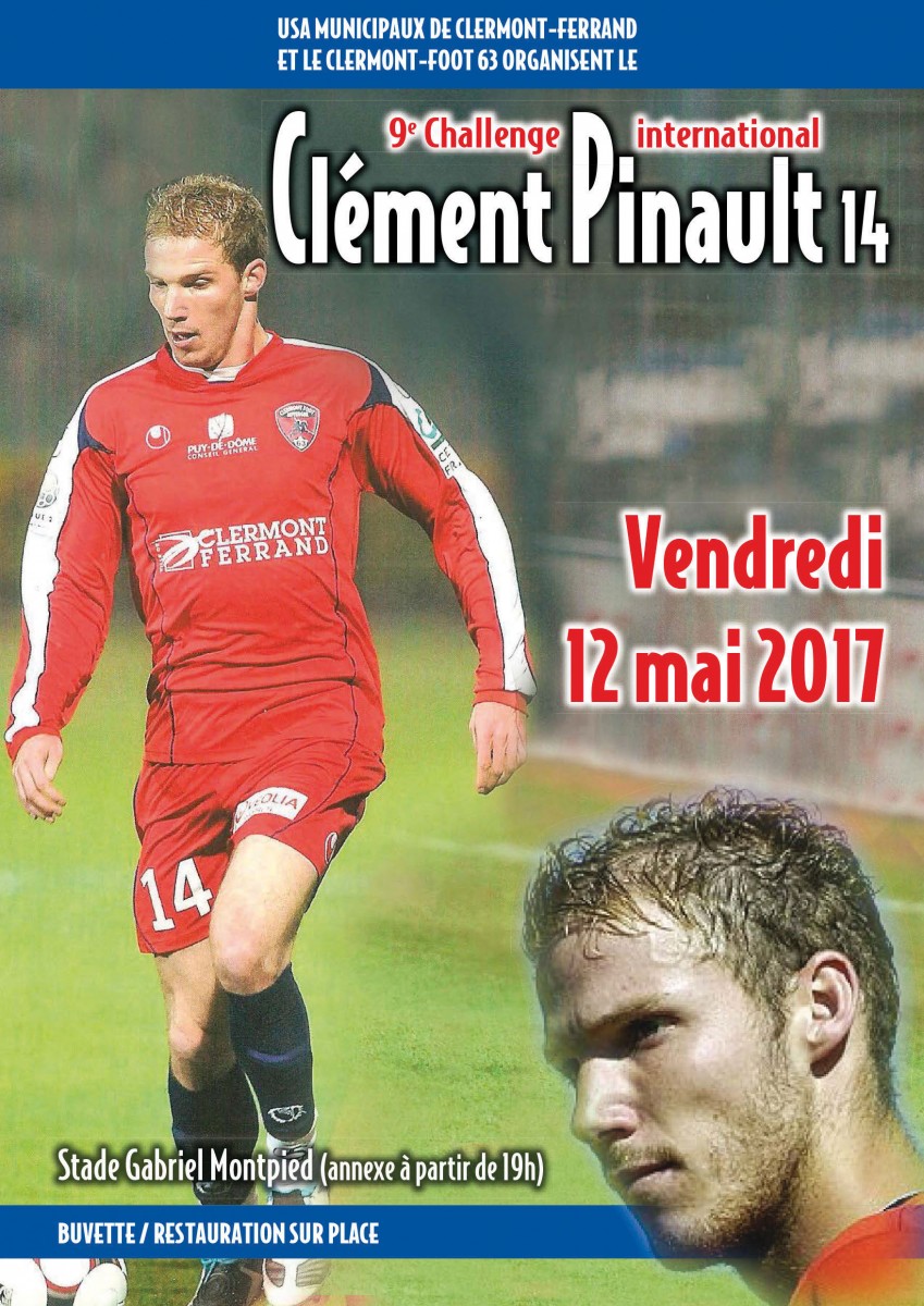 Le Clermont Foot 63 et l'USA Municipaux de Clermont-Ferrand organisent le 9ème Challenge International Clément Pinault 14, vendredi 12 mai à partir de 19h sur le terrain annexe du stade Gabriel-Montpied. Buvette et restauration sur place.