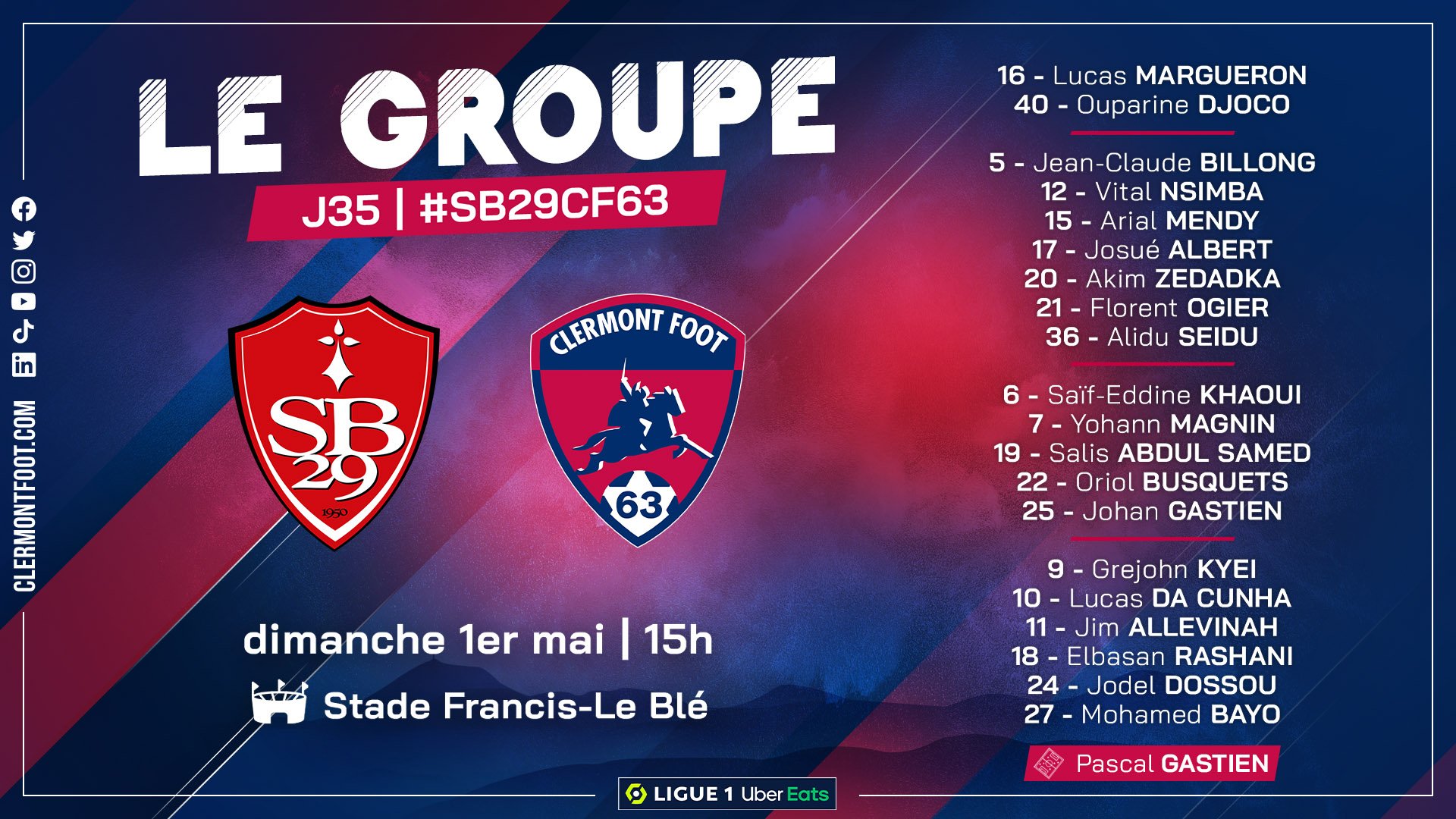 Les Clermontois n’ont pas connu la défaite depuis 3 matchs (1V, 2N), ce qui n’était pas arrivé depuis les 4 premières journées de championnat (2V, 2D). Au regard du calendrier difficile de leurs concurrents directs, ils pourraient avoir une belle carte à jouer ce dimanche. Néanmoins, Pascal Gastien ne compte pas dépendre des autres : « On ne peut pas compter sur les résultats de nos concurrents pour assurer notre maintien. Il nous reste 4 matchs importants, 4 matchs pour prendre des points. Le déplacement à Brest sera capital. »