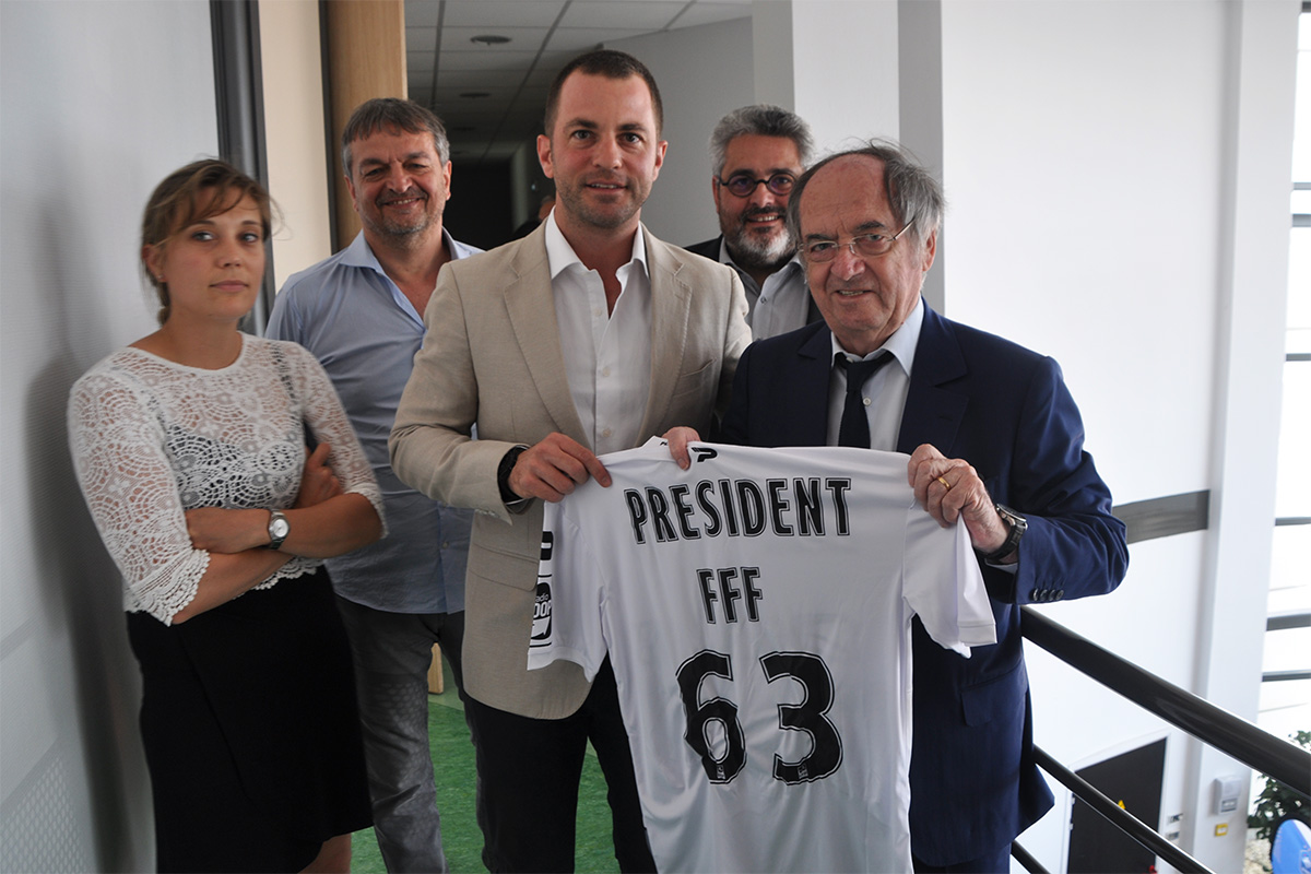 Invité à l’inauguration officielle des nouveaux locaux du District de Football du Puy-de-Dôme, le président Ahmet Schaefer a pu échanger avec Noël le Graet, président de la Fédération Française de Football, avant de lui remettre un maillot officiel du Clermont Foot 63 en présence de Mr le Maire de Clermont-Ferrand Olivier Bianchi et de Caroline Bévillard, conseillère au sport au Conseil Régional d’Auvergne Rhône Alpes.