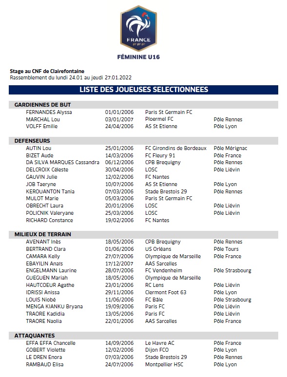 Anissa Idrissi, pensionnaire du pôle espoir de Lyon et membre de l’équipe U18F du club est convoquée pour 4 jours de stage à Clairefontaine du 24 au 27 janvier prochain.
