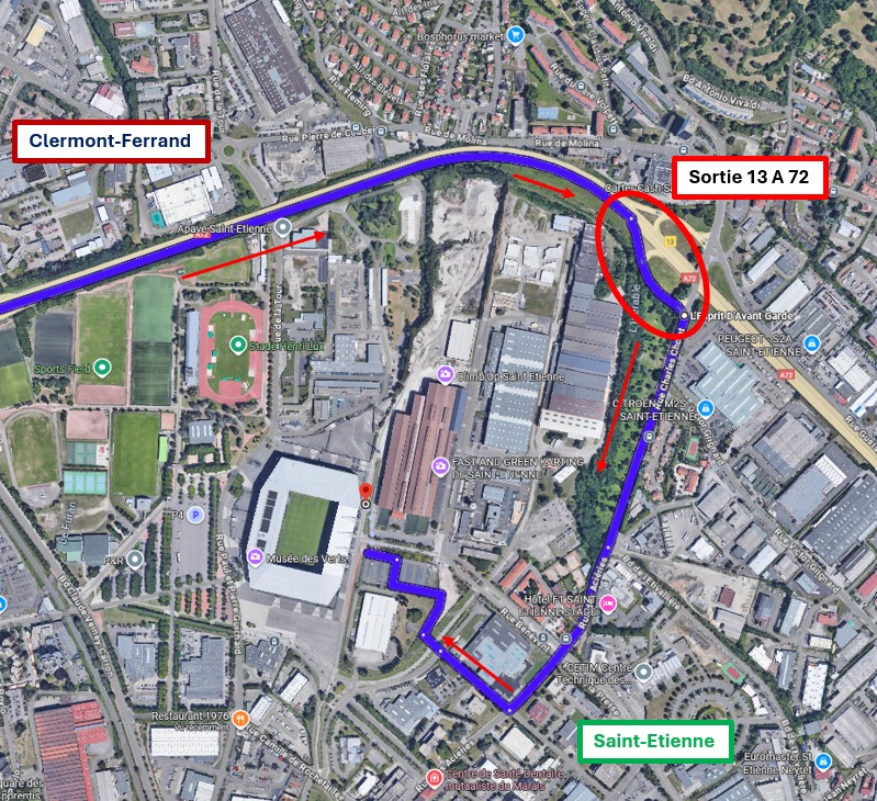 – Tout droit jusqu’au stade Geoffroy-Guichard.