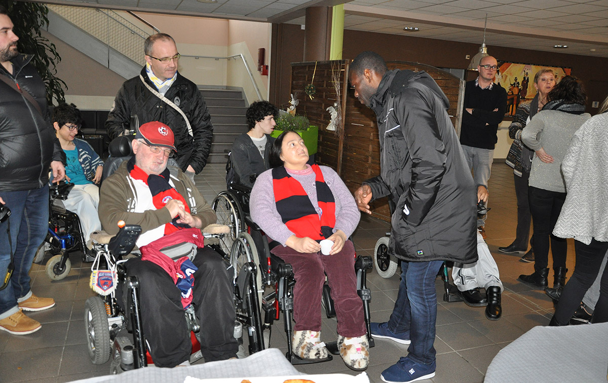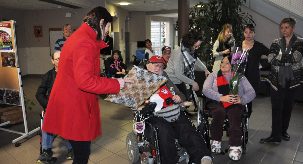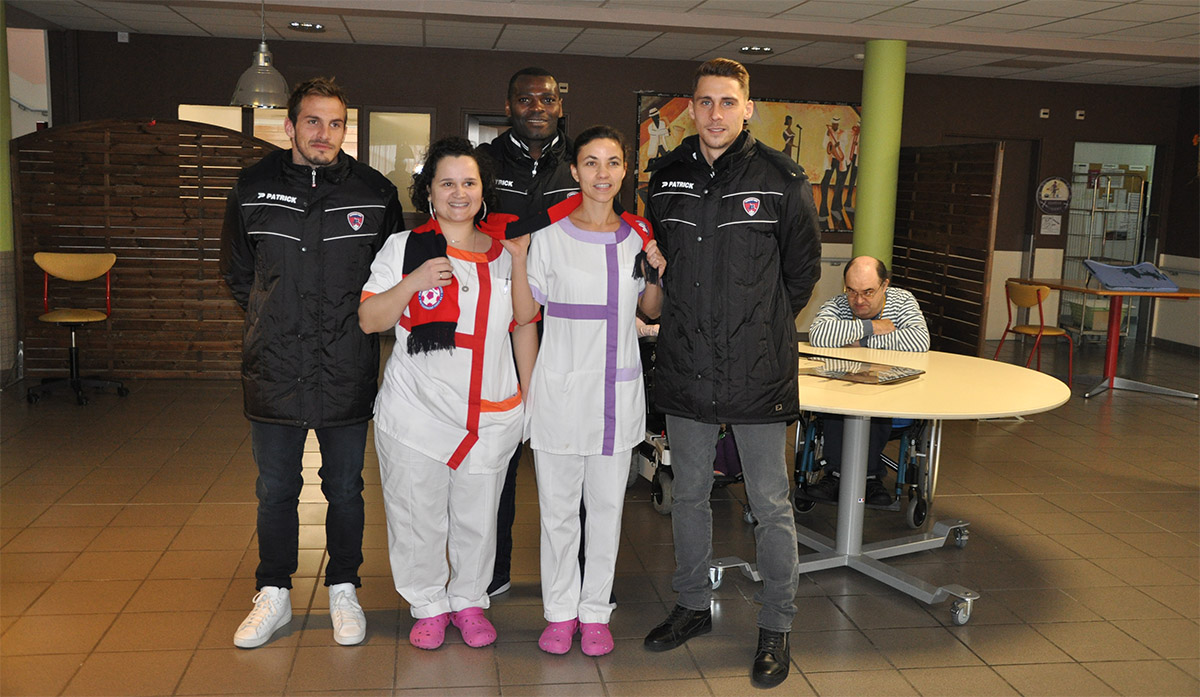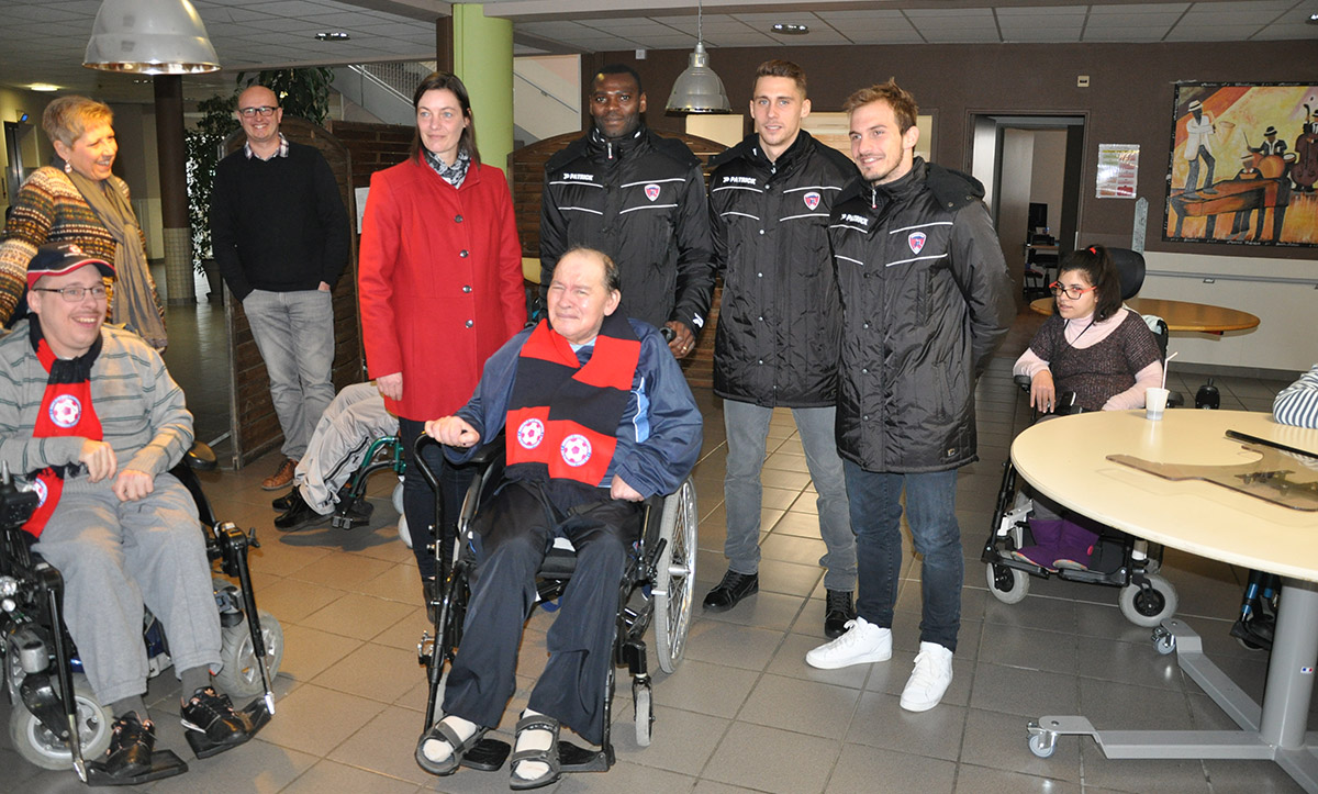 Corinne Diacre, Eugène Ekobo, Rémy Dugimont et Cyriaque Rivieyran ont rendu visite jeudi dernier aux pensionnaires du foyer pour adultes handicapés de l’Andalhone à Riom.