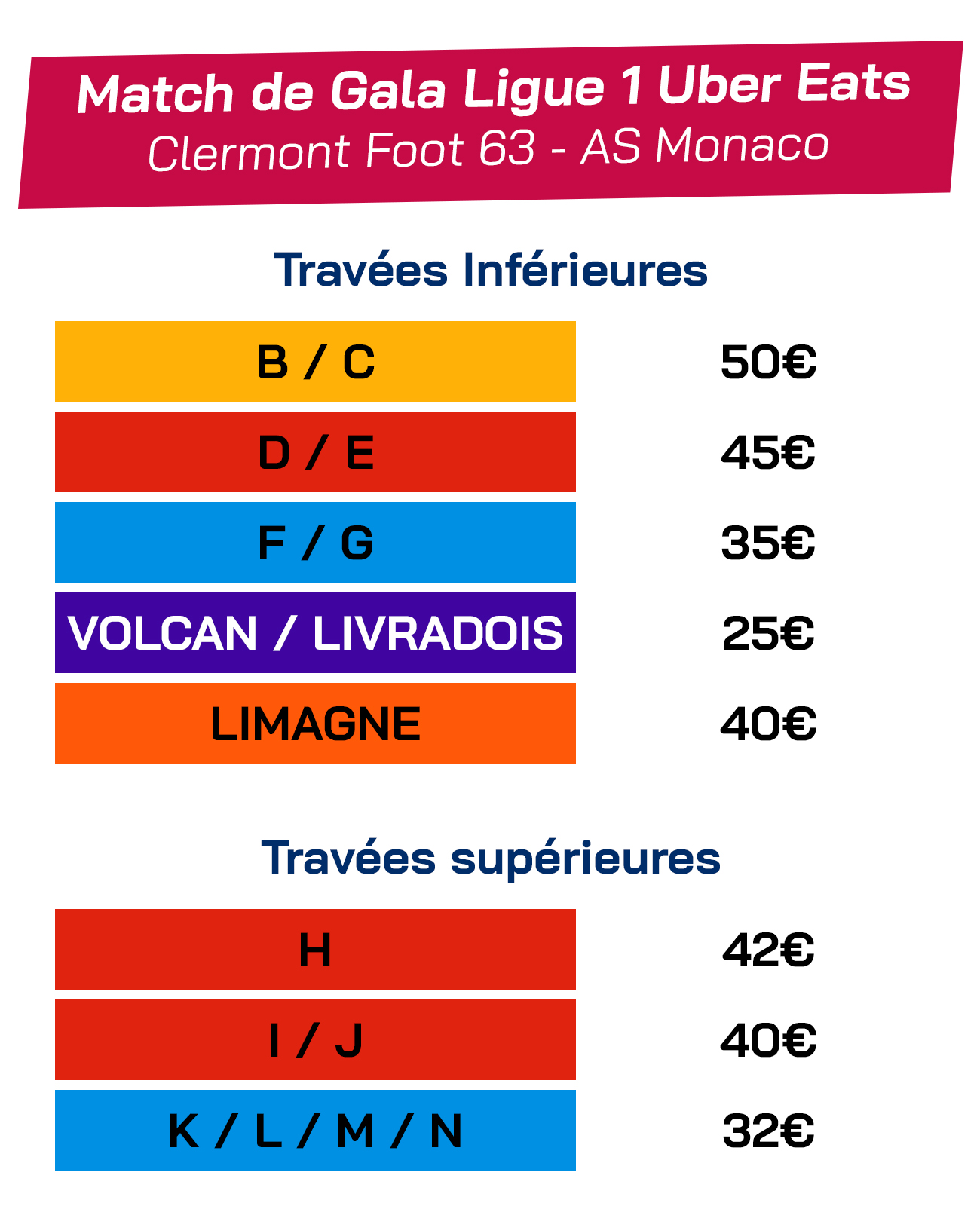 Pour cette rencontre, les tarifs « match de gala » s’appliquent au stade Gabriel-Montpied. Retrouvez ci-dessous toutes les informations pour commander vos places.