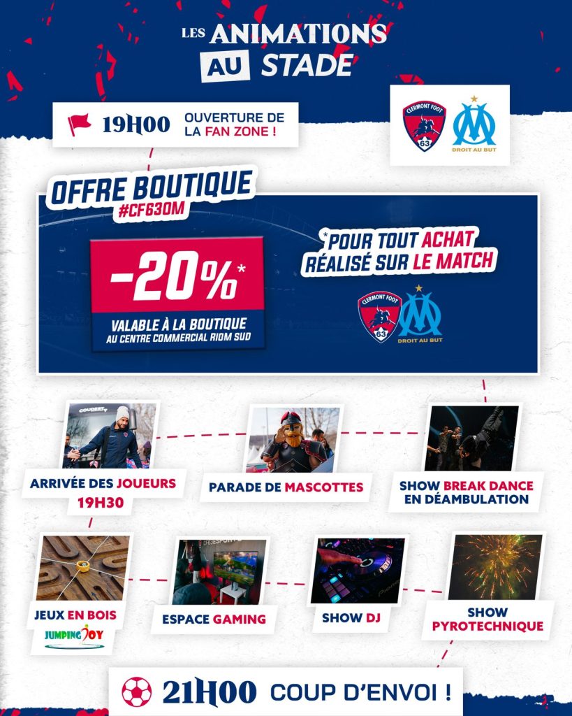 Samedi à 21h, le Clermont Foot 63 défiera l’Olympique de Marseille au stade Gabriel-Montpied. Les portes du stade ouvriront à 19h afin que les spectateurs puissent profiter pleinement des animations exceptionnelles mises en place par le club.