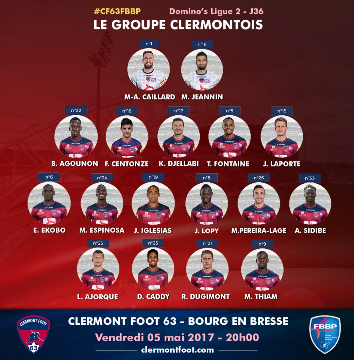 Pour son avant-dernier match de la saison à domicile, le Clermont Foot 63 reçoit Bourg en Bresse. Cédric Avinel est suspendu, Brandon Agounon fait son retour. Découvrez le groupe de 17 joueurs retenus par Corinne Diacre.