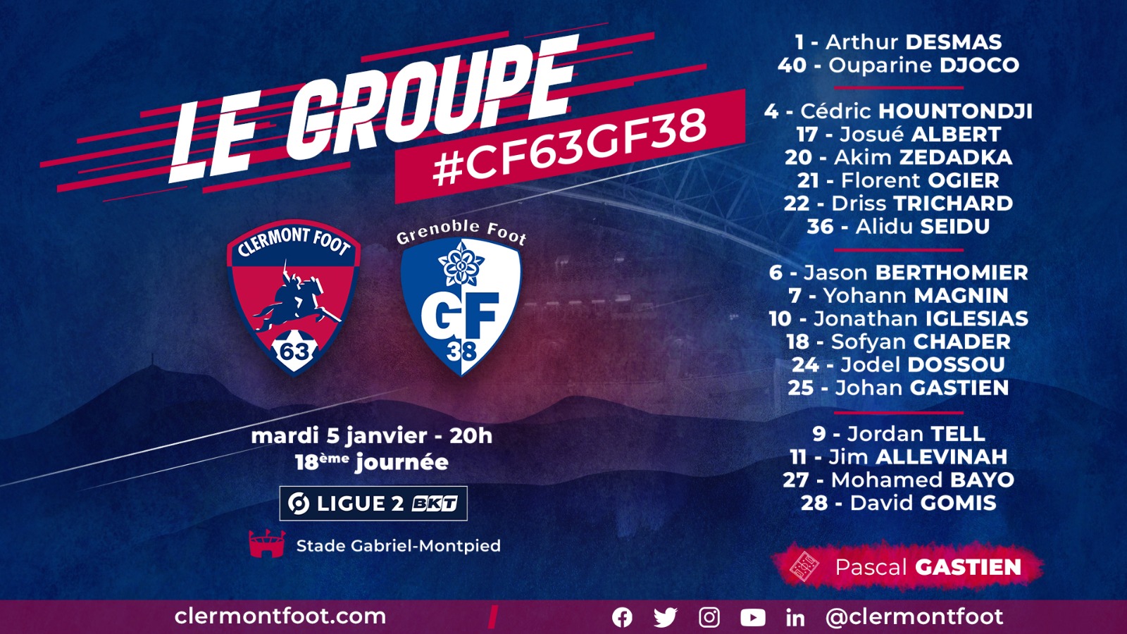 Le Clermont Foot 63 reçoit le Grenoble Foot 38, leader de la Ligue 2 BKT, ce mardi (20h) au stade Gabriel-Montpied pour le premier match de l’année 2021. Retrouvez le groupe de 18 joueurs retenus pour le choc de cette 18ème journée.