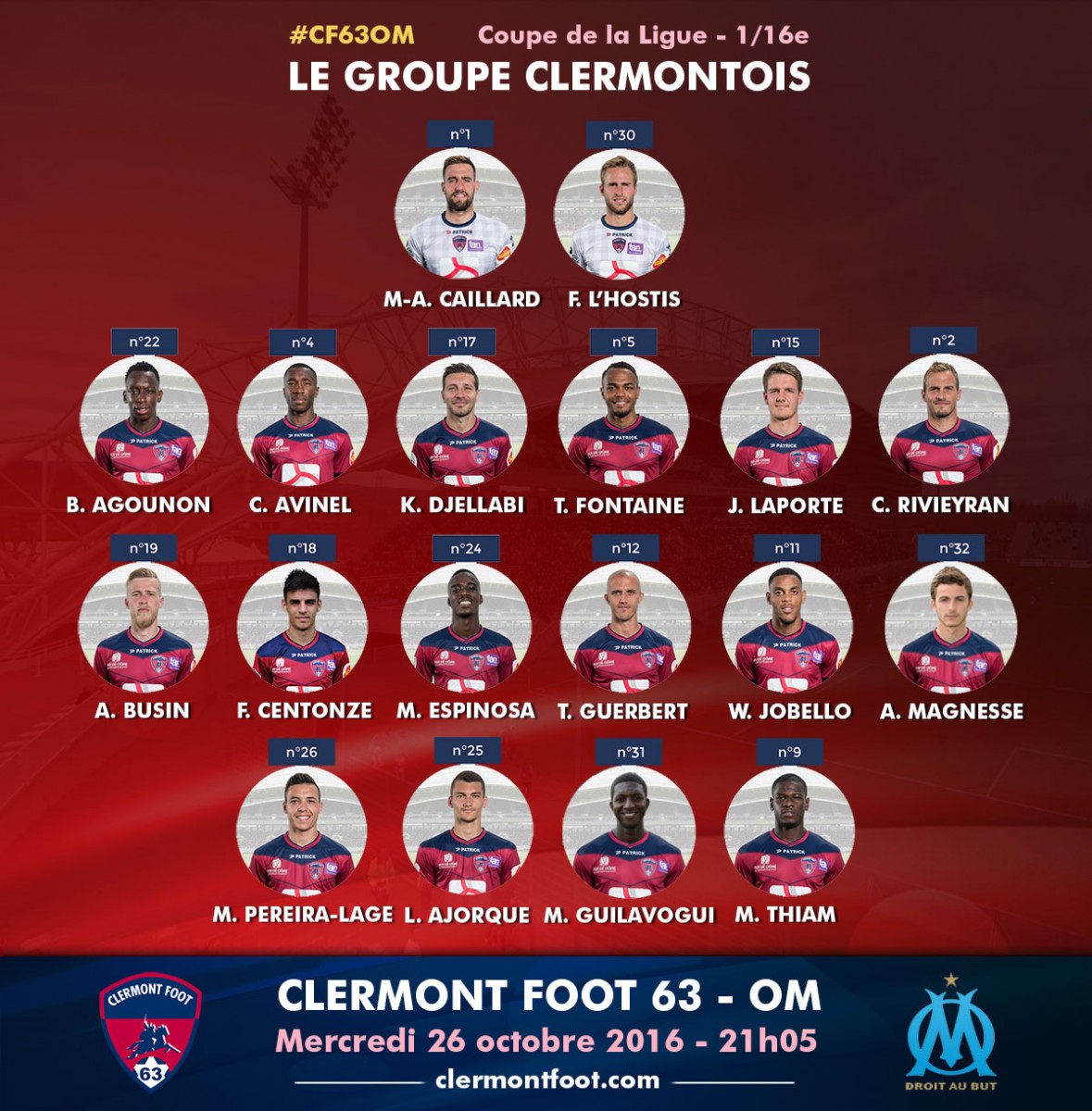 Rudi Garcia emmène quant à lui 19 joueurs à Clermont. Le nouvel entraineur marseillais a convoqué le même groupe que pour affronter le PSG dimanche dernier, à une exception près: forfait, Clinton Njie est remplacé par Romain Alessandrini. Eloigné des terrains depuis le début de saison, l'ancien clermontois va retrouver le groupe olympien dans un stade qu'il connait bien. Abou Diaby, William Vainqueur et Rémy Cabella pointent toujours à l'infirmerie.