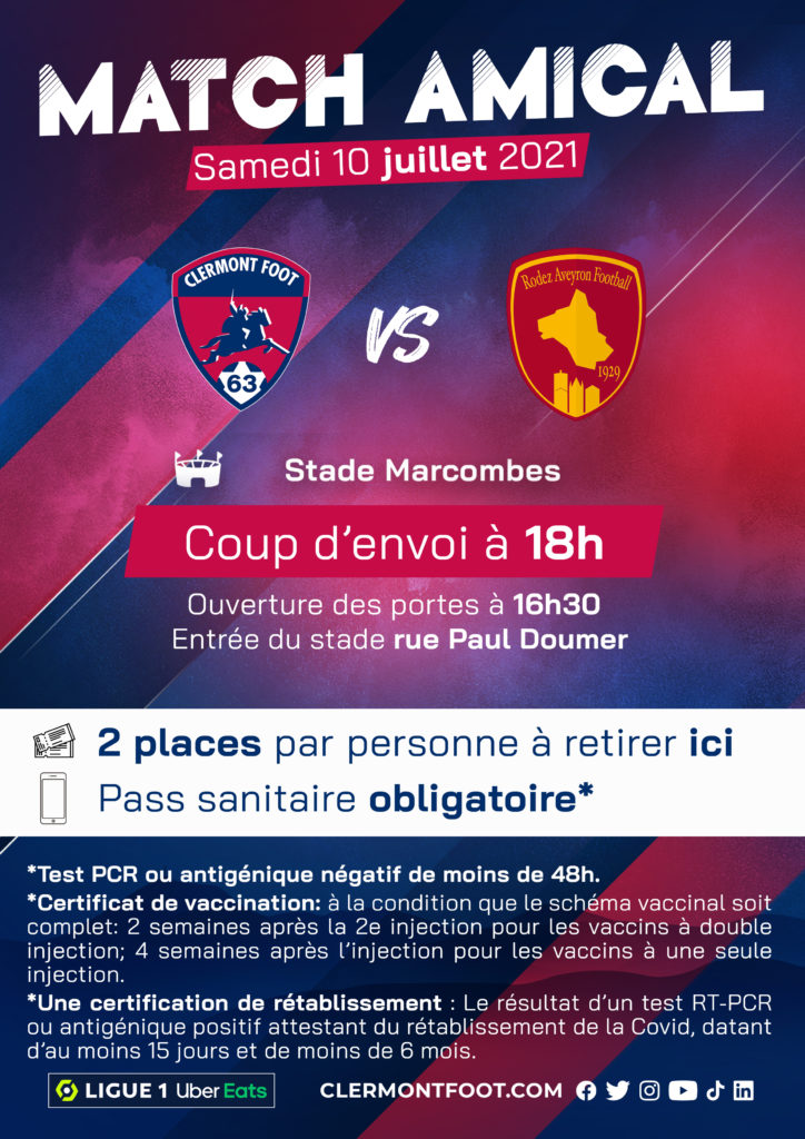 Pour nos Clermontois, il s’agira du seul match amical à Clermont-Ferrand. Pour venir soutenir les joueurs de Pascal Gastien face aux coéquipiers d’Enzo Zidane et Lorenzo Rajot, avant la reprise du championnat de Ligue 1 Uber Eats, retrouvez toutes les infos pratiques ci-dessous.