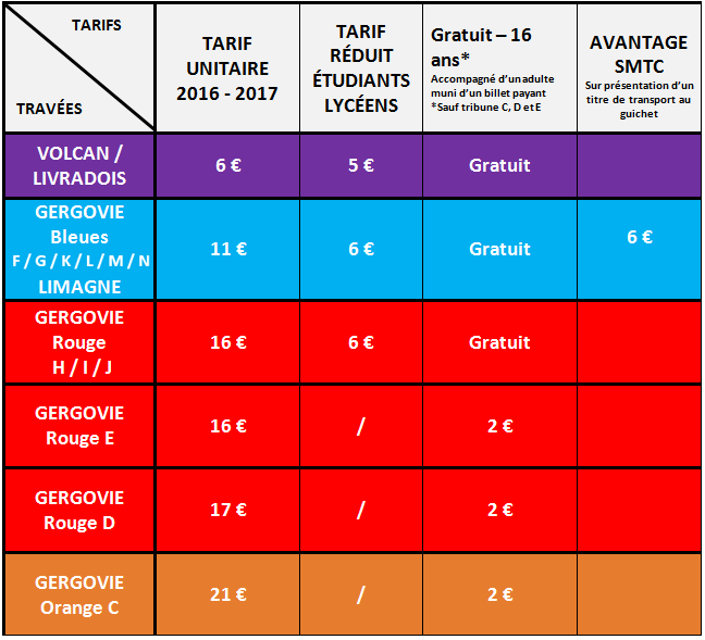Bénéficiez d'une place à 6 € au lieu de 11 € en Tribune Gergovie (travées F, G, K, L, M et N) et en Tribune Limagne sur présentation d'un titre de transport (ticket ou abonnement) aux guichets du stade les soirs de match.
