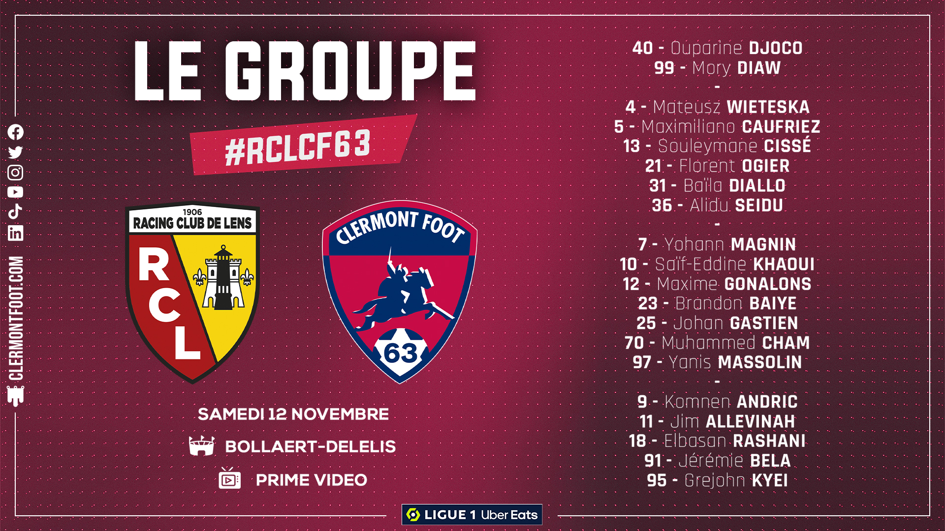 Dixième avec 19 points au compteur à l’aube de ce dernier match de Ligue 1 Uber Eats avant la trêve pour la Coupe du Monde, le Clermont Foot 63 se déplace sur la pelouse du RC Lens avec l’ambition de confirmer sa belle dynamique à l’extérieur face à ce qui se fait de mieux en France.