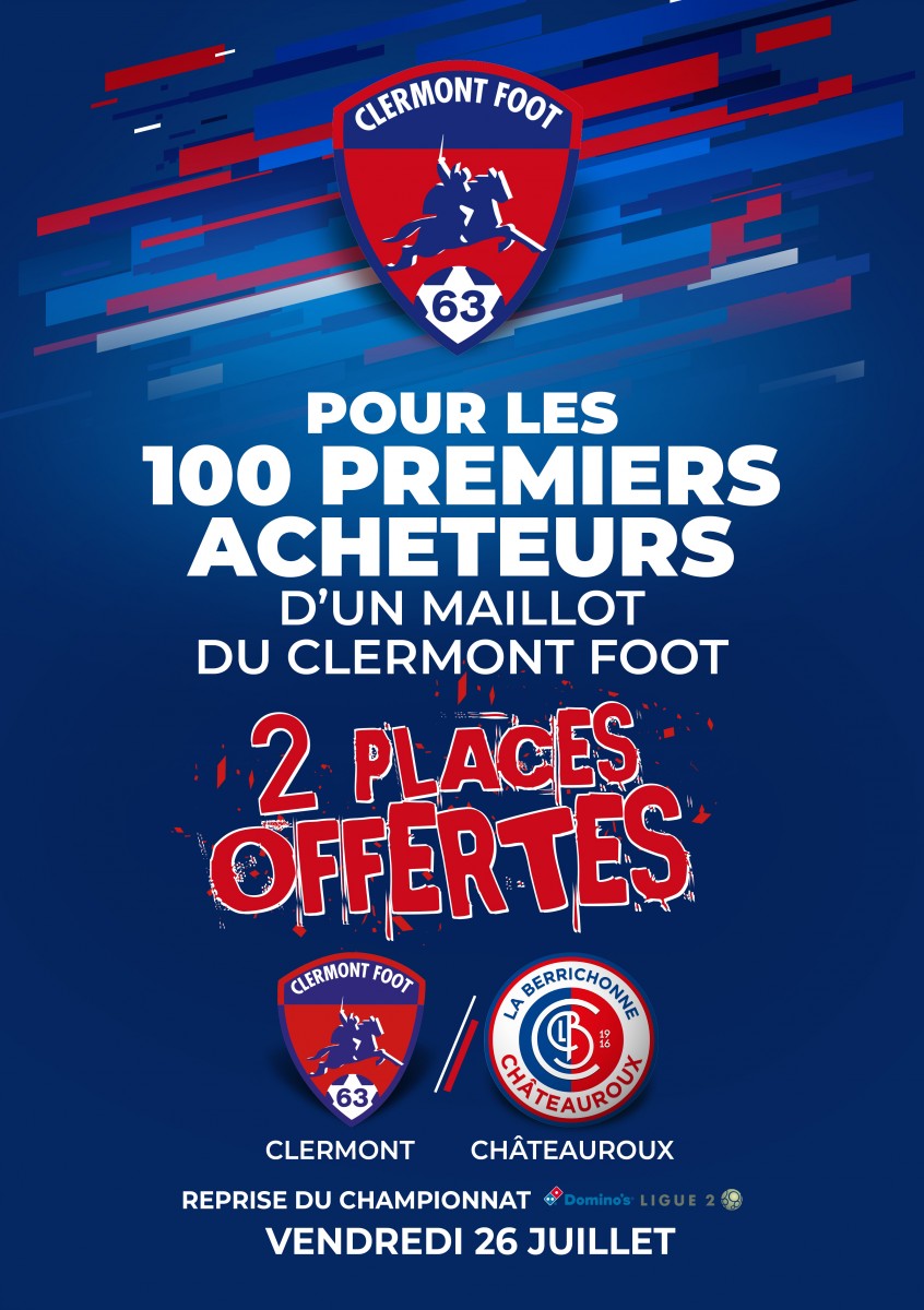 Deux places offertes pour la 1ère journée de championnat, Clermont Foot 63 / Châteauroux (vendredi 26 juillet), pour les 100 premiers acheteurs d’un nouveau maillot !