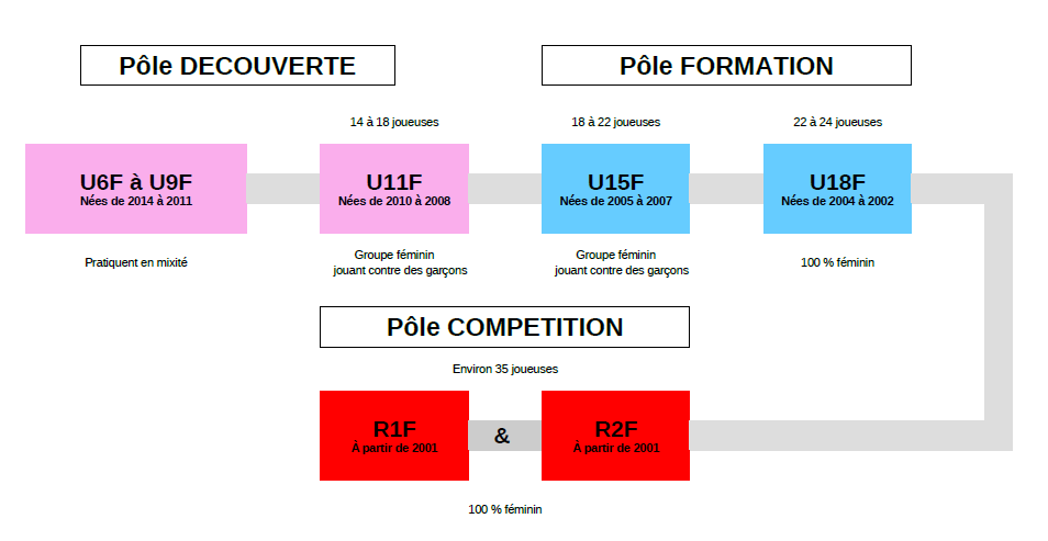 A l’aube de sa sixième saison, la section féminine franchit un nouveau palier avec la création d’une nouvelle équipe U11F et U15F, ainsi qu’avec l’accueil de jeunes filles de 6 à 9 ans en mixité.
