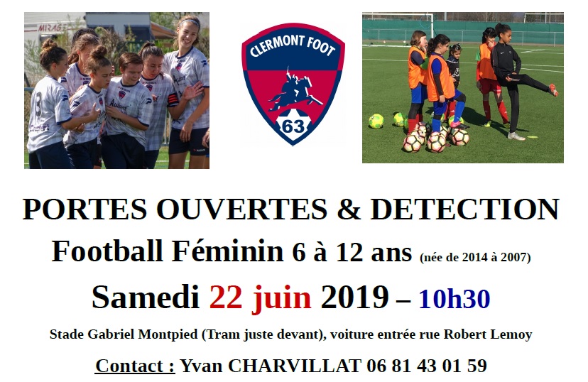 Pour compléter les effectifs U6F U9F en mixité et cette nouvelle équipe U11F, le club organise une porte ouverte et une détection ce samedi 22 juin à 10h30 au stade Gabriel Montpied, pour les joueuses nées de 2014 à 2007.