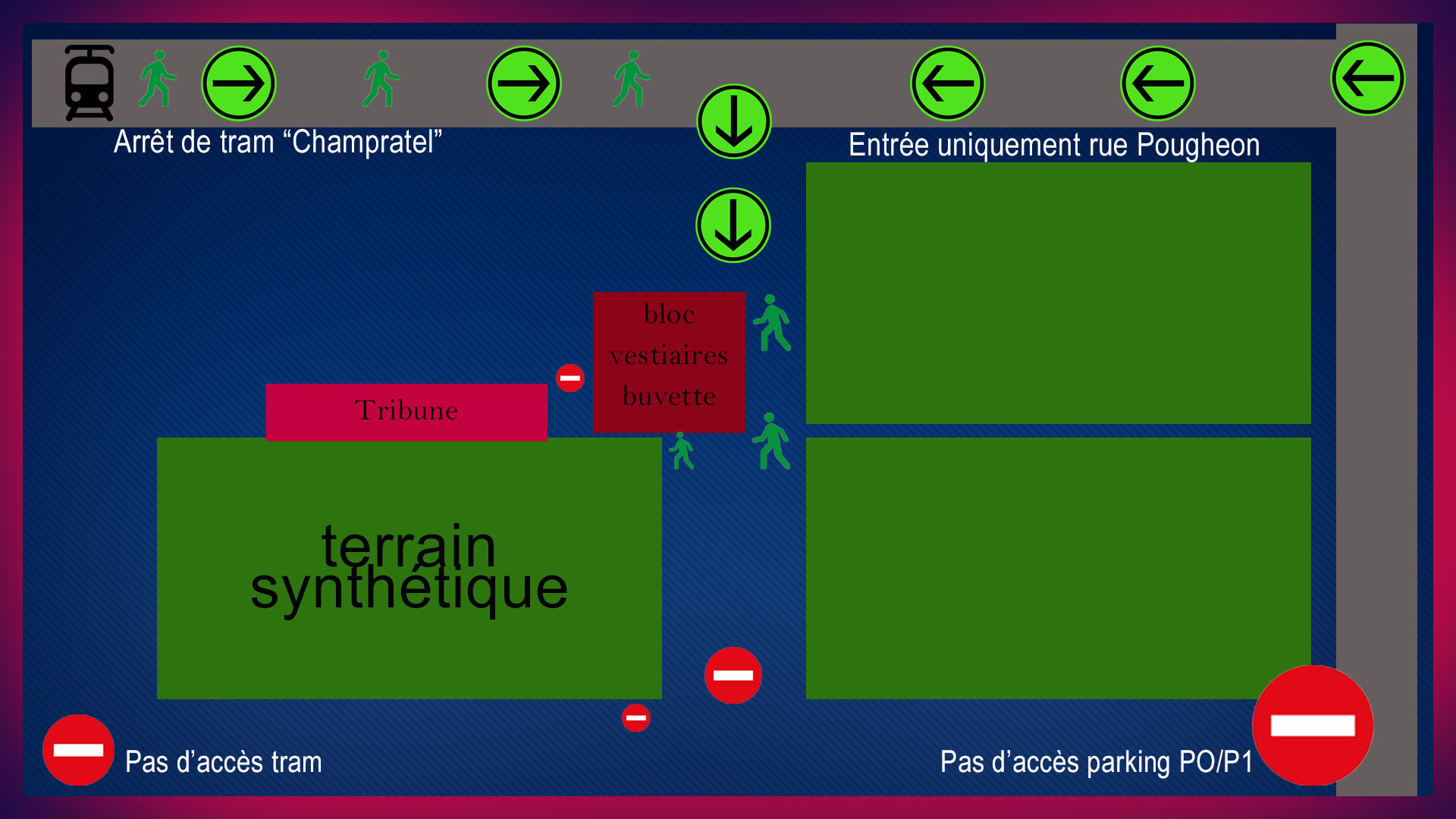 Le seul accès au match de notre équipe féminine se fera par la rue Pougheon, en voiture ou à pied, avec un arrêt tram Champratel.
