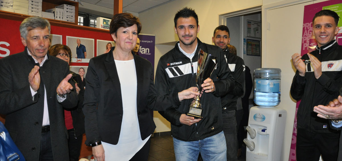 Buteur à Lens, l'attaquant prêté par les Girondins de Bordeaux a reçu son Trophée ce mardi 5 avril dans les locaux de la Caisse Crédit Mutuel Massif Central de Chamalières, des mains de sa Directrice, Sylvie Arnaud, en présence de Serge Masseboeuf, responsable développement du CMMC, Jean-Pierre Nicolas, responsable du Secteur Puy-de-Dôme et Allier du CMMC, Claude Michy, Corinne Diacre et les jeunes U9 du FC Chamalières, club partenaire du CF63.