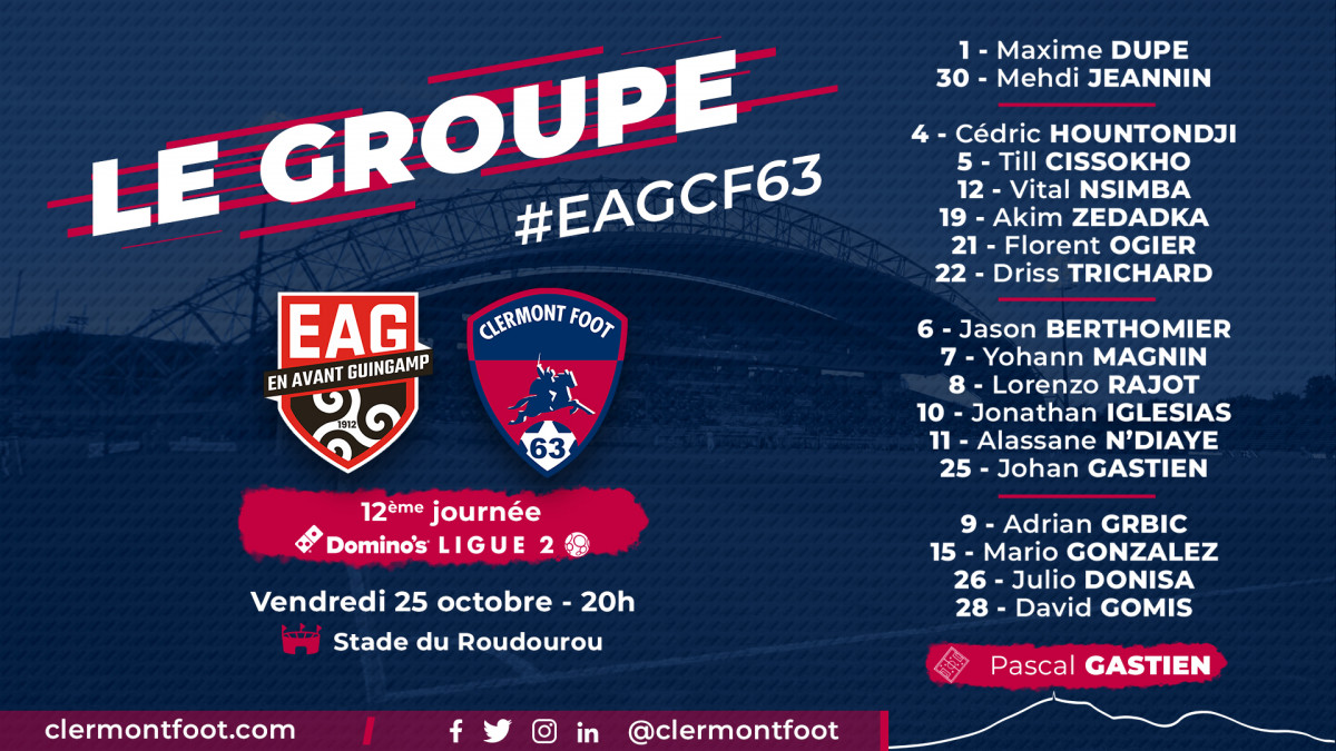 Voici le groupe pour aller défier Guingamp au stade de Roudourou, ce vendredi pour la 12ème journée de Domino’s Ligue 2: