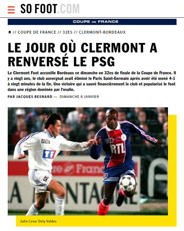 Le Clermont Foot 63 signait l'un des exploits les plus retentissants de la Coupe de France (4-4, 4 TAB à 3) face au grand Paris Saint-Germain de Raï, tenant en titre de la Coupe d'Europe des vainqueurs de coupe.