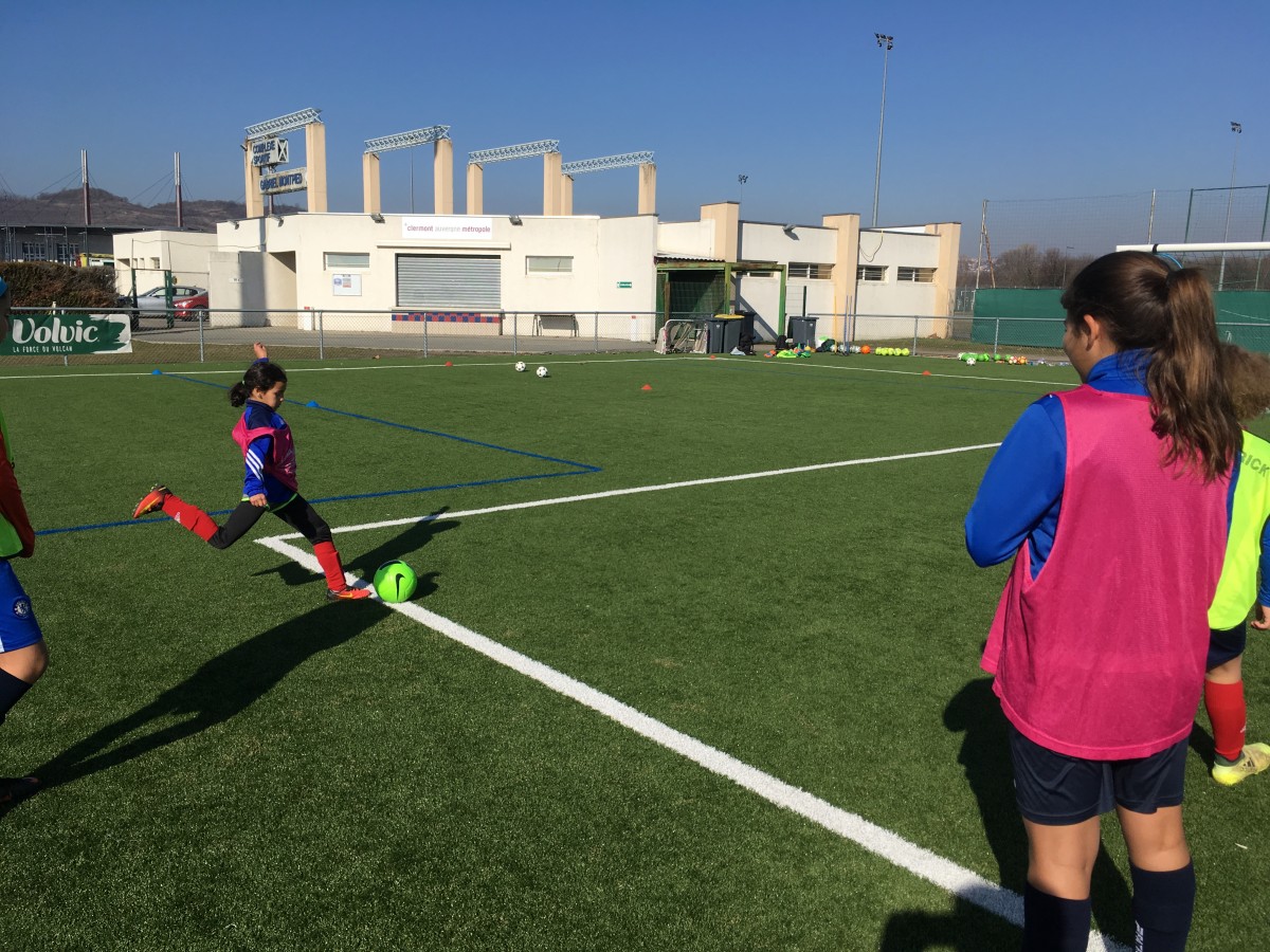 Encadrées par Yvan CHARVILLAT (responsable de la section) et Justine EYRAUD (service civique, joueuse CF63 et éducatrice U9F), 19 filles de 6 à 13 ans licenciées au sein de l’entente CEBAZAT CLERMONT FOOT 63 ont profité du magnifique soleil ce lundi 25 février sur l’annexe du stade Gabriel Montpied.