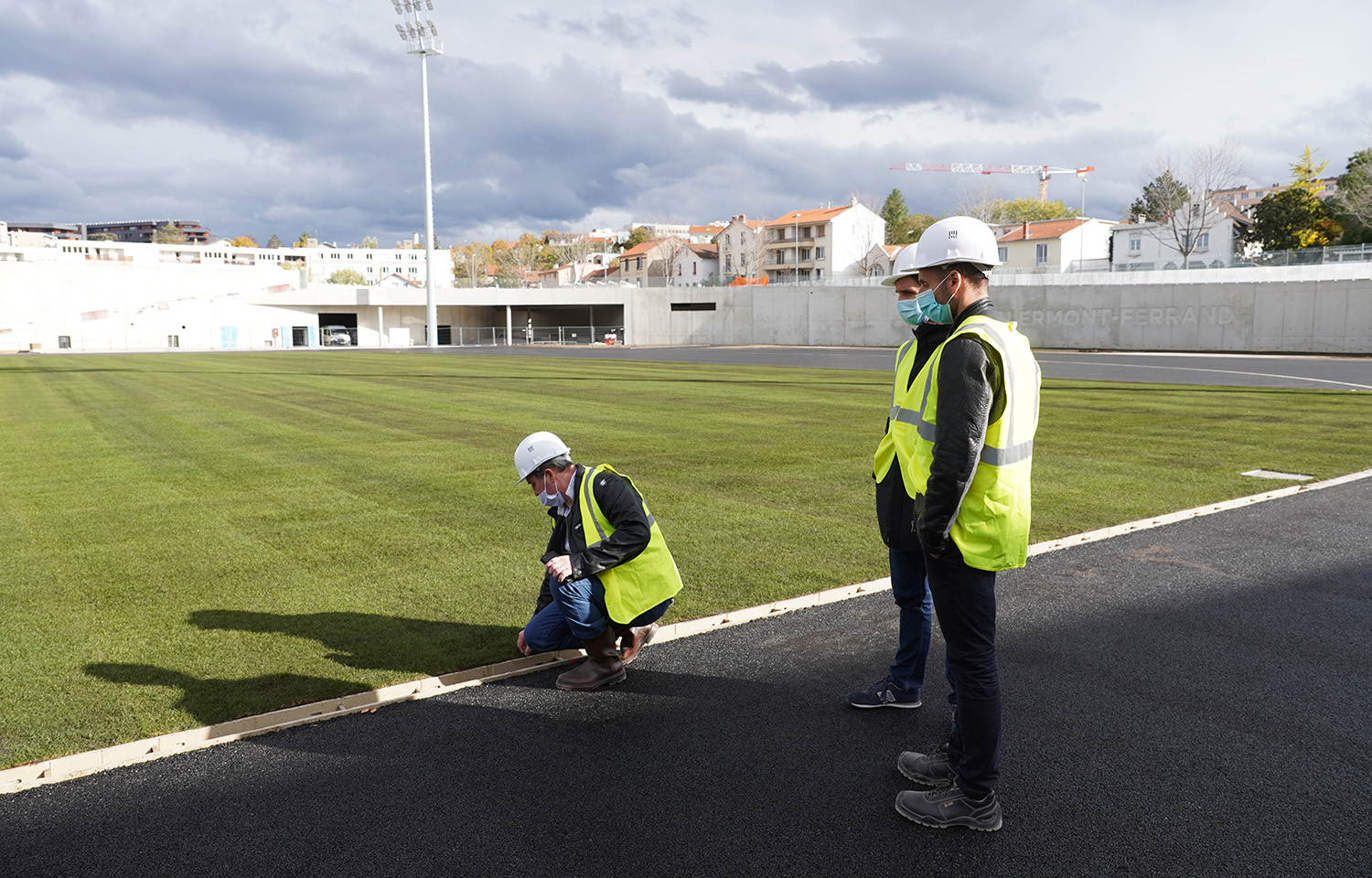 Les dirigeants du Clermont Foot 63 ont ainsi pu observer la pelouse naturelle flambant neuve destinée à la pratique du football ainsi que la nouvelle tribune de 1 500 places comprenant vestiaires, bureaux et club house.