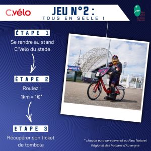 Une scène, 2 C.vélo équipés d’un home trainer, un compteur de kilomètres et c’est parti pour plus de 3h de pédalage pour la bonne cause. En effet, pour chaque kilomètre parcouru par les participants, 1€ sera reversé au profit du Parc naturel régional des Volcans d’Auvergne. Une bonne raison de se mettre en selle. De plus, chaque participant recevra, gratuitement, un ticket de tombola valable pour le tirage au sort d’après-match.