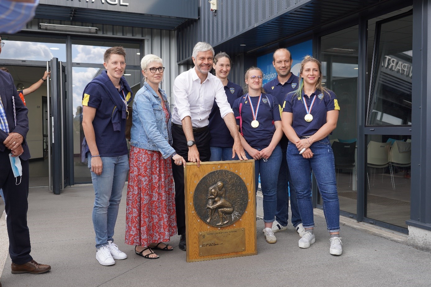 Au cours de cette visite, les joueuses de l’ASM Romagnat, nouvellement championnes de France, ont présenté leur Bouclier à l’invitation de Claude Michy, Président de Sport Féminin & Co.