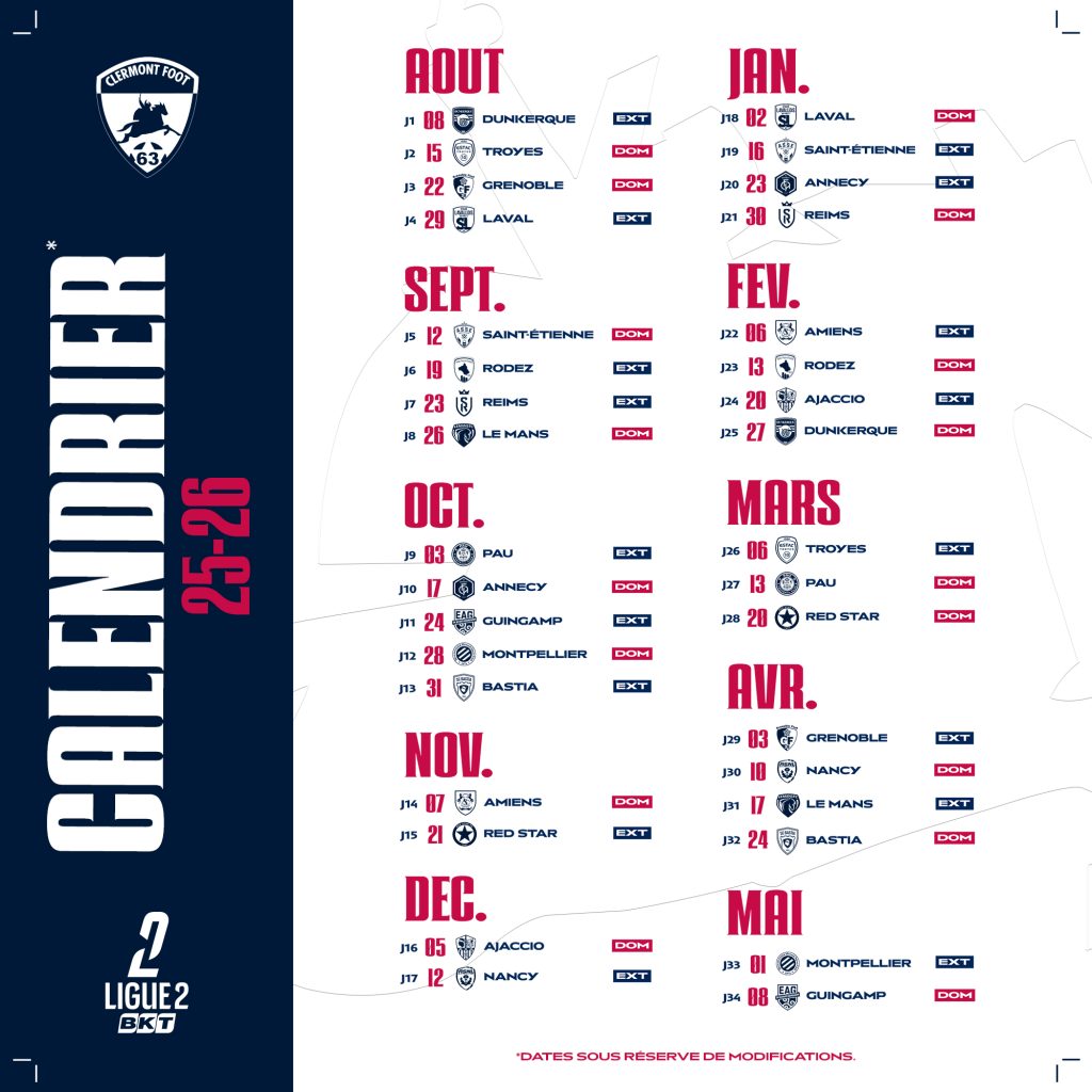Le CF63 débutera sa saison par un déplacement à Dunkerque le week-end du 8 août avant d’enchaîner 2 rencontres à domicile face à Troyes puis Grenoble, et terminera l’exercice 25-26 par une réception de Guingamp.