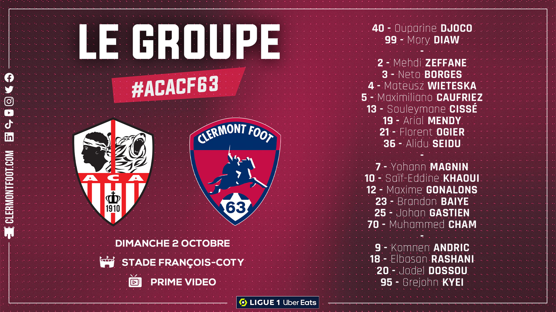 Pour ce déplacement en Corse, le Clermont Foot 63 devra faire sans Jérémie Bela et Jim Allevinah, tous les deux blessés avant la trêve internationale et trop courts pour espérer jouer dimanche. De retour à l’entraînement collectif, Mehdi Zeffane intègre le groupe pour la première fois de la saison en Ligue 1 Uber Eats.