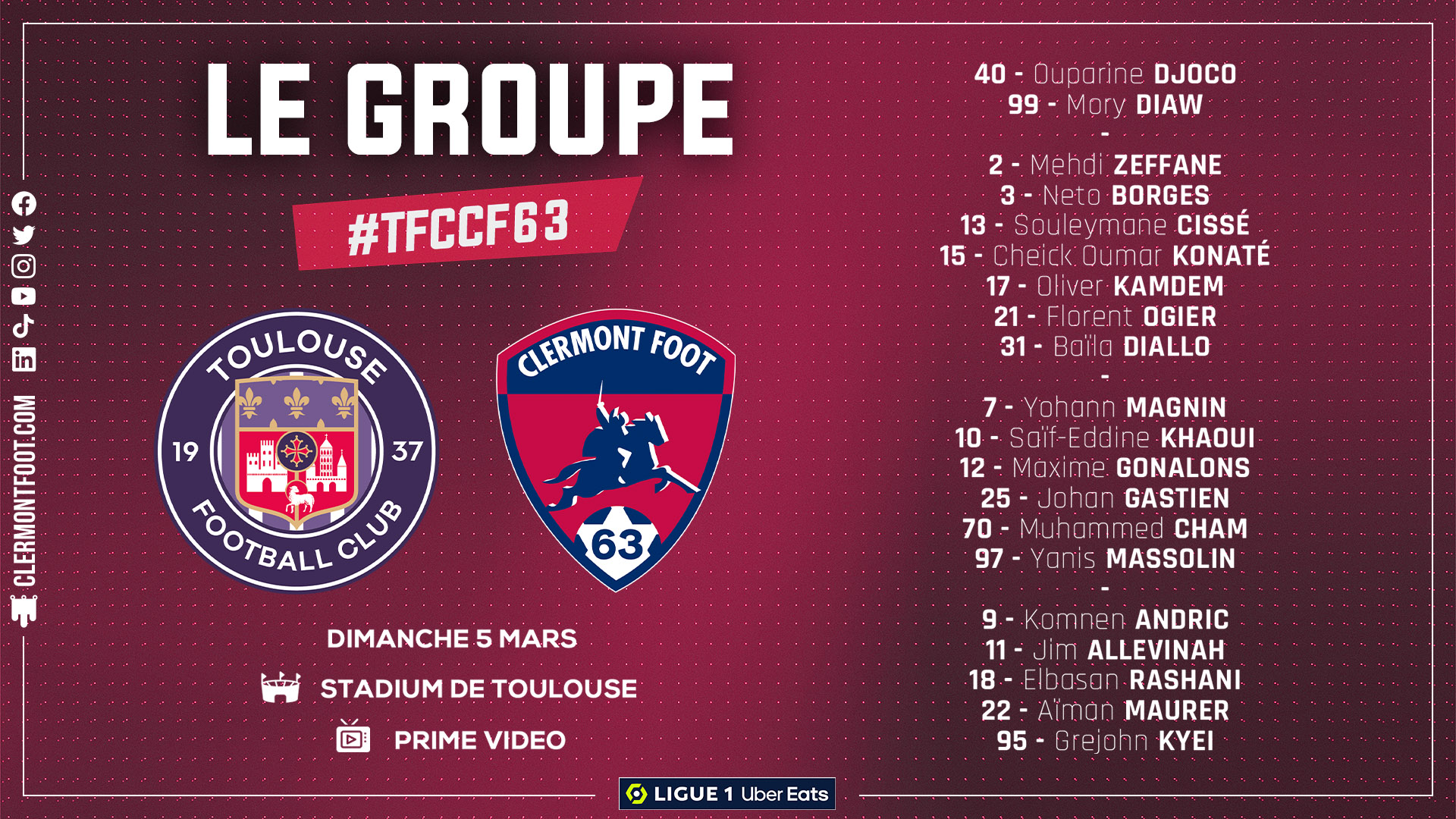 Pour ce déplacement à Toulouse, le CF63 sera toujours privé d’Alidu Seidu ainsi que de Maximiliano Caufriez qui, après avoir repris l’entraînement avec le groupe, souffre d’une nouvelle gêne musculaire qui le force à déclarer forfait pour ce déplacement. Dans le groupe la semaine passée, Jérémie Bela (genou) ne sera pas non plus de la partie. Tout comme Mateusz Wieteska qui sera suspendu pour un cumul de cartons jaunes.
