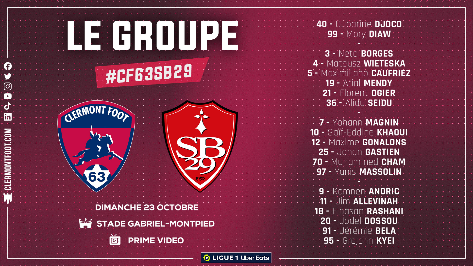 Face à un groupe brestois qui connaît (très) bien le Clermont Foot 63 puisqu’il compte dans ses rangs Bruno Grougi, Franck Honorat ou encore Mathias Pereira-Lage, les Clermontois pourront compter sur le retour de suspension de Johan Gastien. Malade à Monaco, Maxime Gonalons postulera lui aussi pour une place dans le onze de départ. Jérémie Bela, blessé depuis la réception de Troyes, effectue son retour dans le groupe. Souleymane Cissé devrait quant à lui être laissé au repos ce week-end.