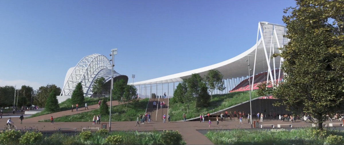 Perspective du stade Gabriel-Montpied en phase 1, pour un piéton en provenance de la Ligne A du tramway