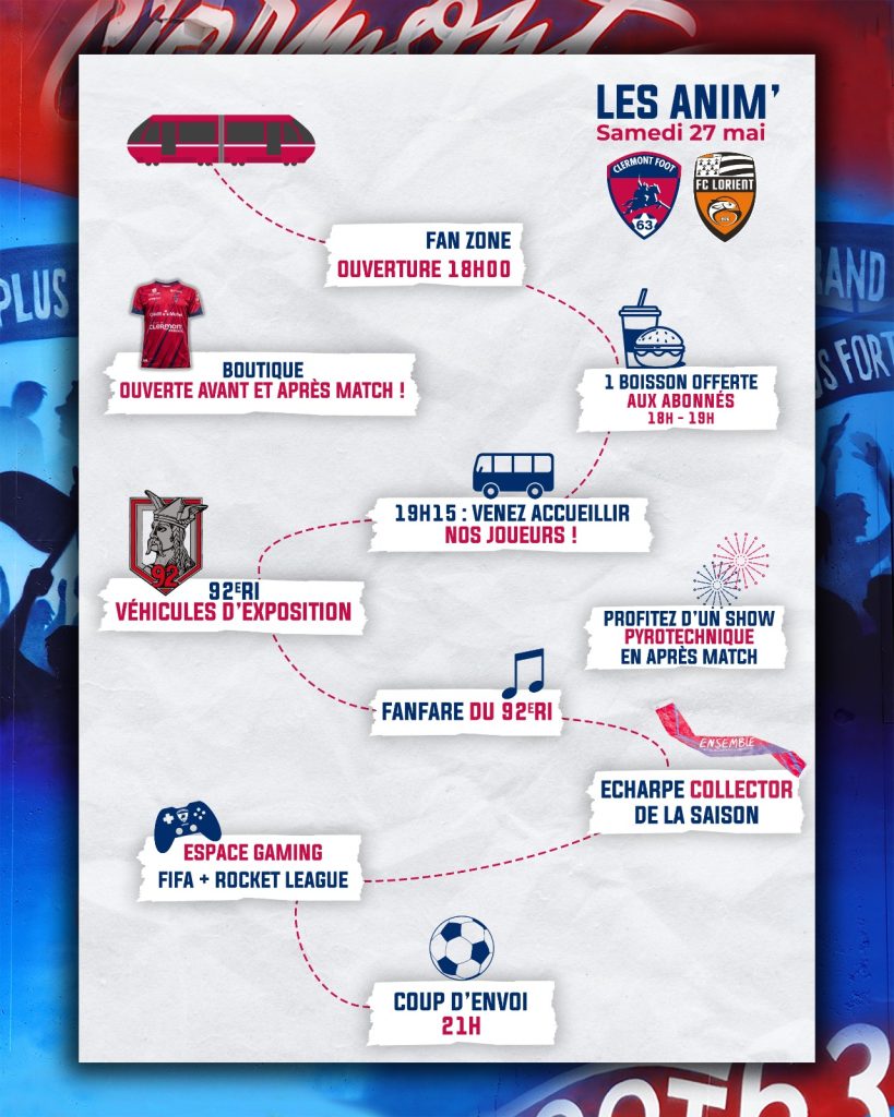 Pour le compte de l’avant-dernière journée de Ligue 1 Uber Eats, le Clermont Foot 63 accueille le FC Lorient à 21h au stade Gabriel-Montpied. Pour sa dernière à domicile de la saison, le club a souhaité fêter avec ses supporters cette saison historique. Animations, show pyrotechnique tiré depuis la pelouse, fanfare… Rendez-vous à partir de 18h en FanZone pour le grand final au Stade Gabriel-Montpied !