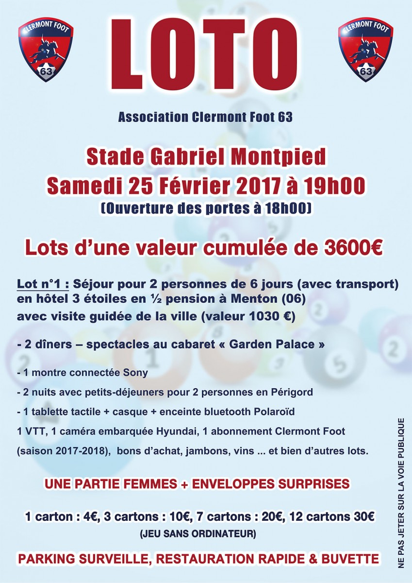 L’Association du Clermont Foot 63 organise son 5e Loto le Samedi 25 Février à 19h à l'Espace Club du Stade Gabriel-Montpied (Ouverture des portes à 18h00).