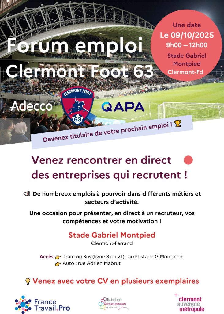 Vous recherchez un emploi ? Rendez-vous le jeudi 9 octobre de 9h à 12h au Stade Gabriel-Montpied avec vos CV ! Ouvert à tous, en accès libre et sans inscription préalable, l’événement réunira une quarantaine d’entreprises qui recrutent. De nombreuses offres d’emploi seront proposées tout au long de la matinée. Cet événement est organisé en collaboration avec notre partenaire ADECCO, QAPA et France Travail