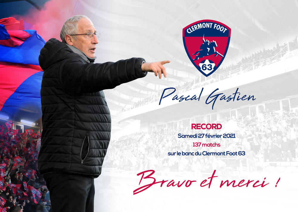 Pascal Gastien est devenu ce samedi 27 février 2021, à l’occasion de la réception de Valenciennes, l’entraineur le plus capé de l’histoire du Clermont Foot 63 !