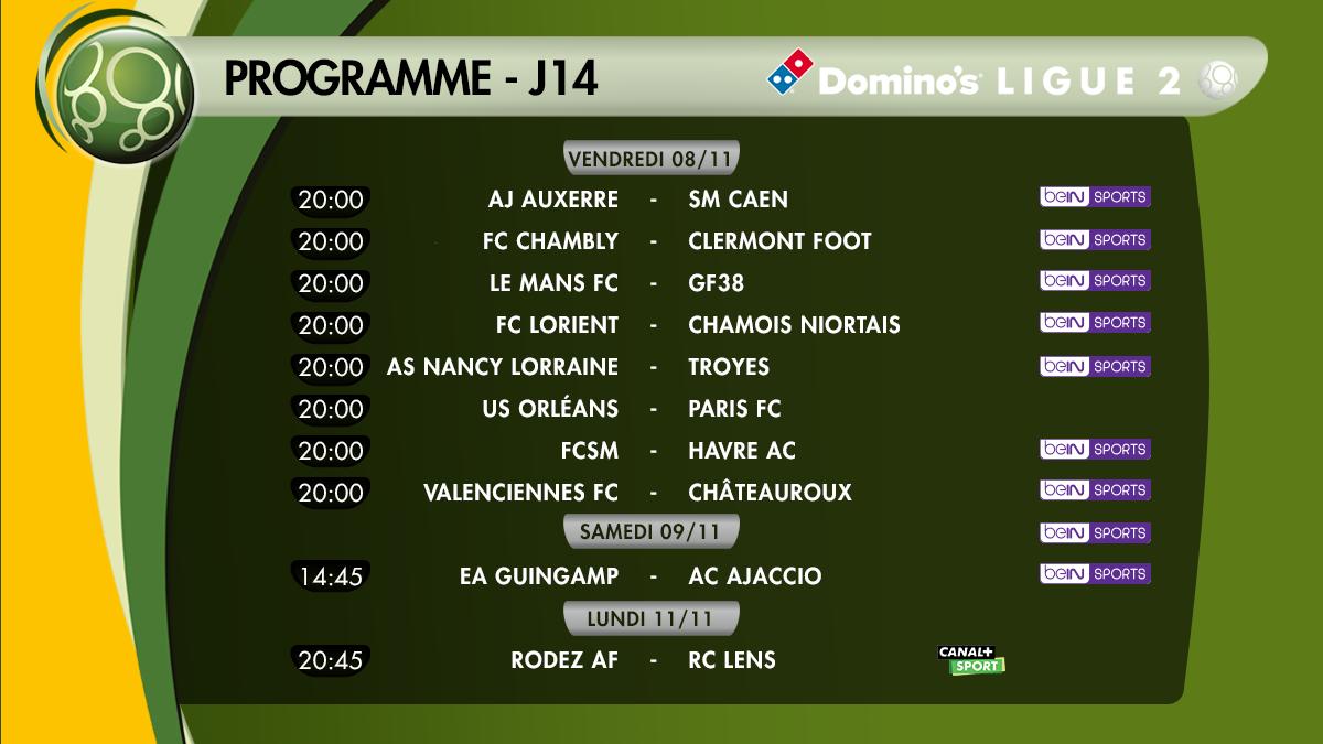 La programmation TV de la 14ème journée de Domino’s Ligue 2 a été dévoilée. La rencontre Chambly / Clermont se jouera le vendredi 8 novembre à 20h00 et sera diffusée sur les canaux de beIN Sports.