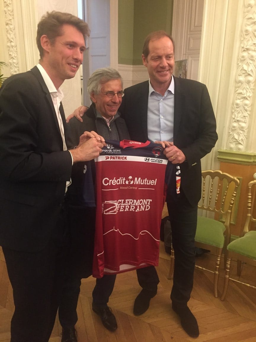 Invité à la présentation de l’étape à l’Hôtel de ville, François Ligny, Directeur Général du CF63, lui a remis un maillot du club floqué à son nom, avant de prendre une photo souvenir aux côtés de Claude Michy, également présent à la cérémonie.