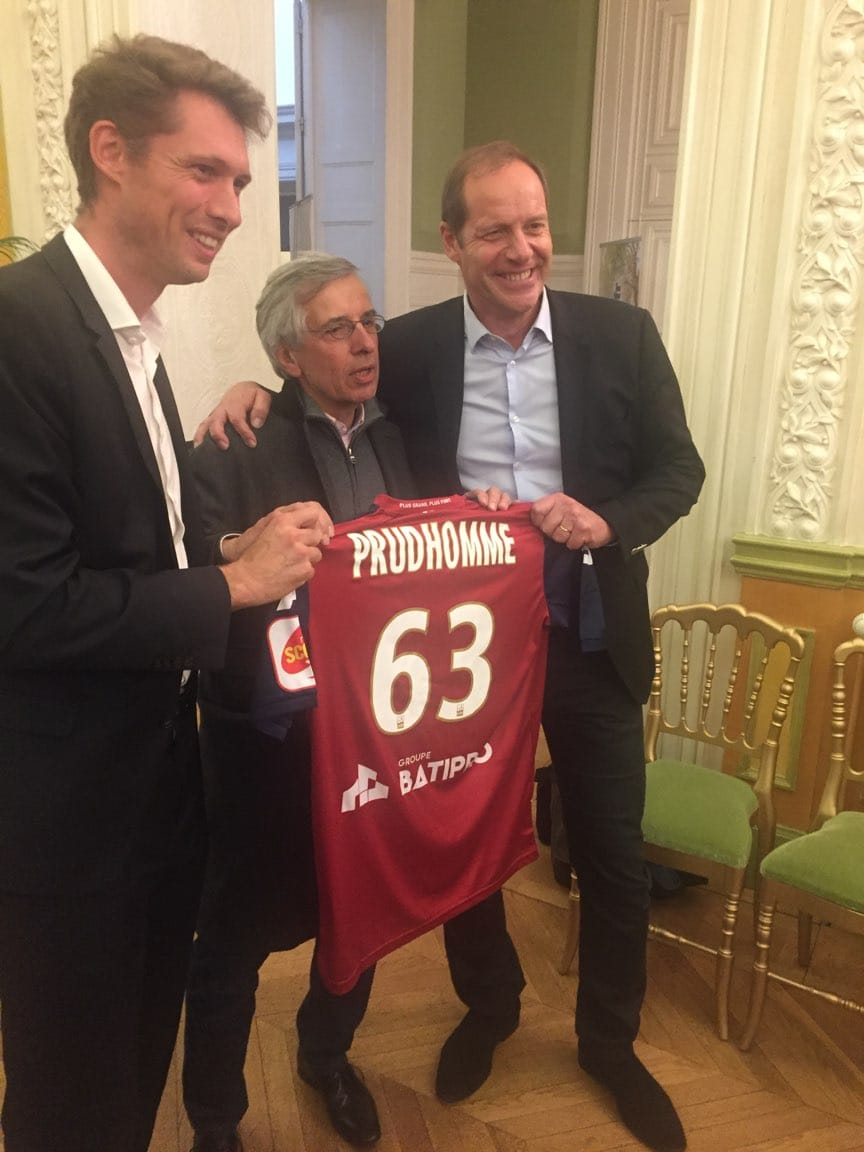Invité à la présentation de l’étape à l’Hôtel de ville, François Ligny, Directeur Général du CF63, lui a remis un maillot du club floqué à son nom, avant de prendre une photo souvenir aux côtés de Claude Michy, également présent à la cérémonie.