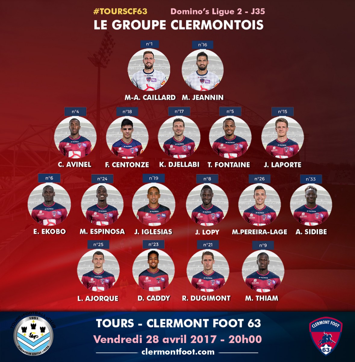 Invaincu depuis 4 matchs à l'extérieur, le Clermont Foot 63 se rend ce vendredi sur la pelouse du Tours FC. Derniers au soir de la 29ème journée, les tourangeaux, désormais 16èmes, sont en passe d'obtenir leur maintien en Ligue 2. Les coéquipiers de Denis Bouanga restent sur trois succès consécutifs à domicile et sur une impressionnante série d'invincibilité de 8 matchs. Une belle opposition pour les clermontois, toujours en course pour terminer dans la première moitié de tableau. Découvrez le groupe de 17 joueurs retenus par Corinne Diacre.
